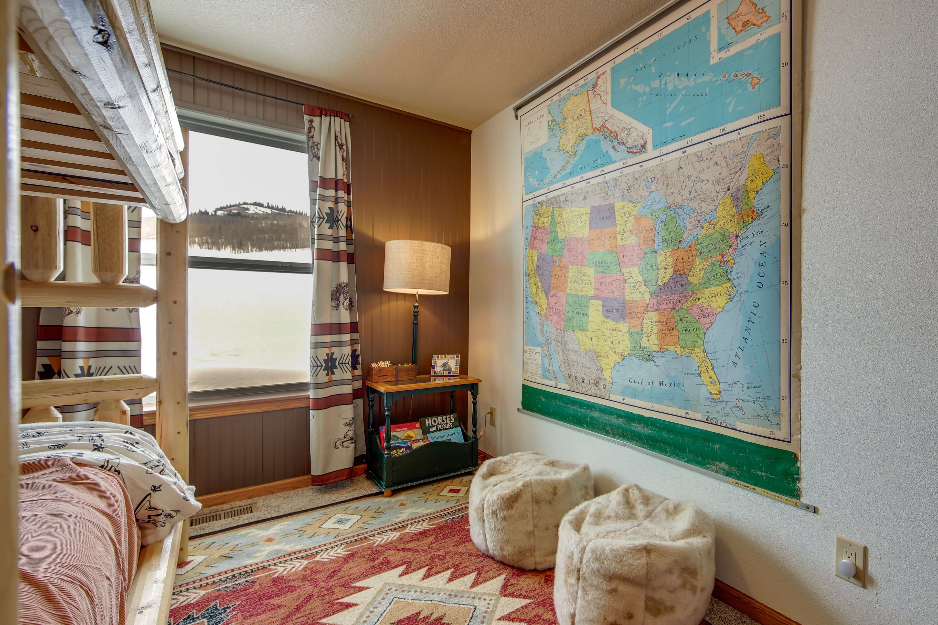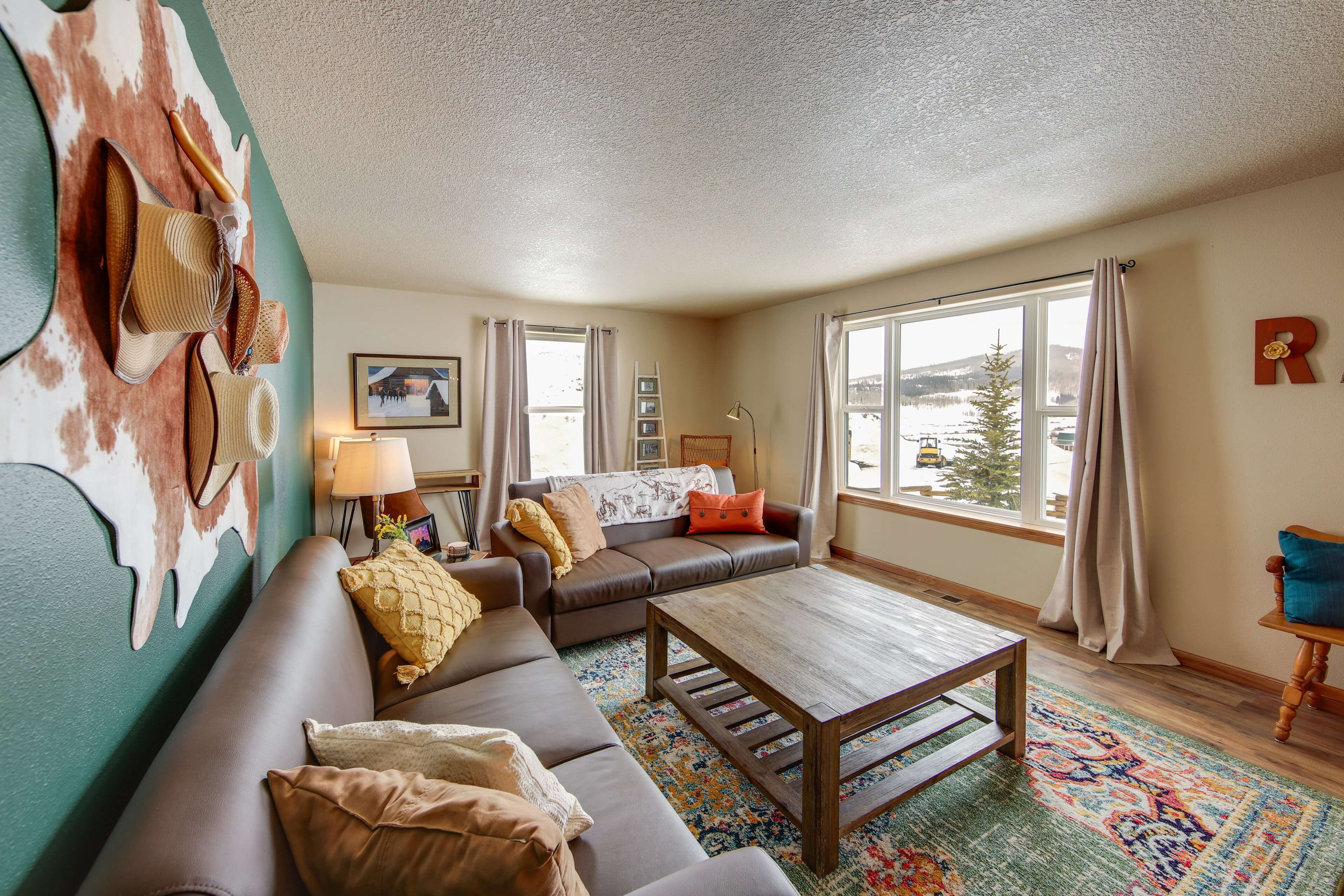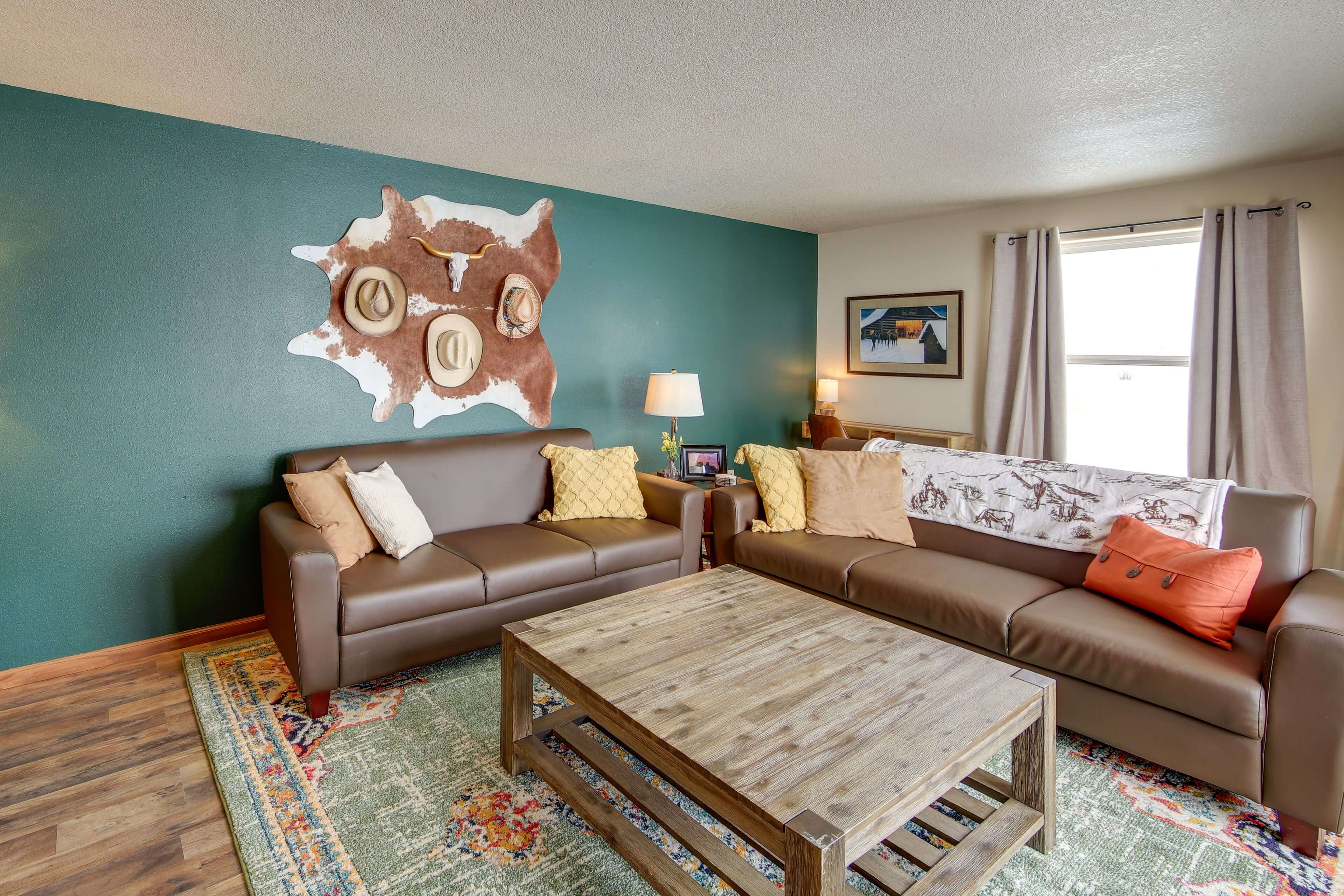 Step inside and you’ll find a bright, open layout built for easy group living. The kitchen flows into the dining and living areas, making it simple to cook, eat, and hang out together. Three bedrooms offer flexible sleeping options, and two full bathrooms make mornings a breeze. The kids’ corral adds a touch of western fun, and the swings in the yard are a favorite for sunset wind-downs. Big windows bring the outdoors in, with mountain views from every window!