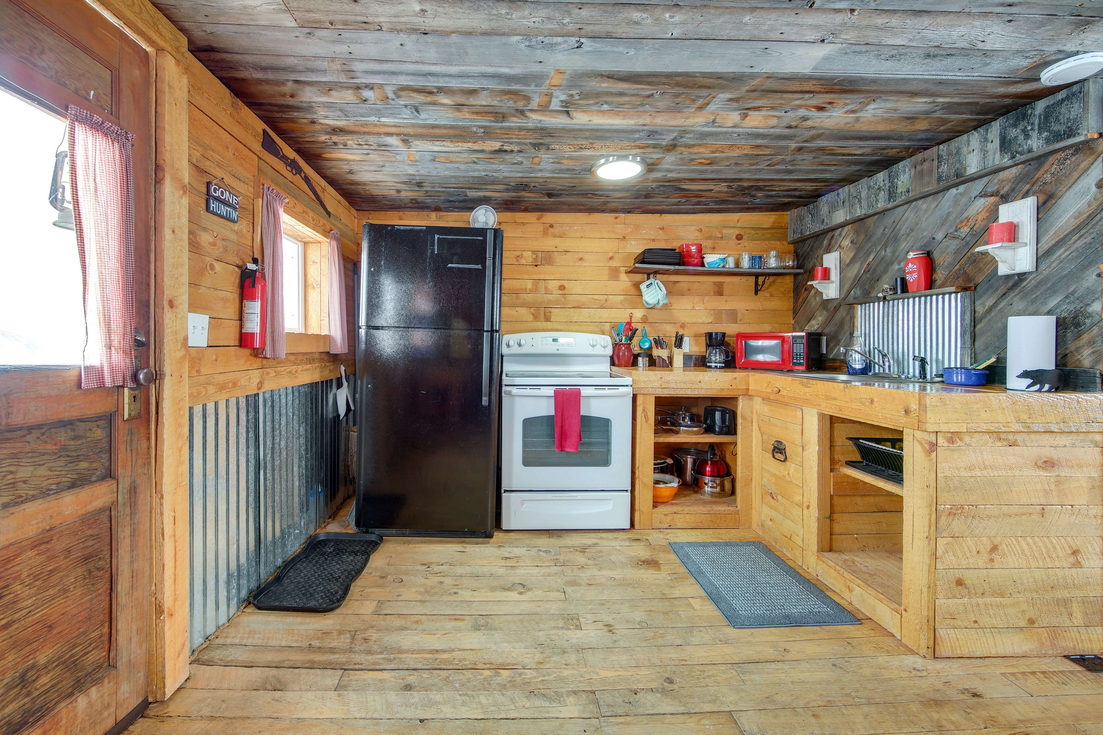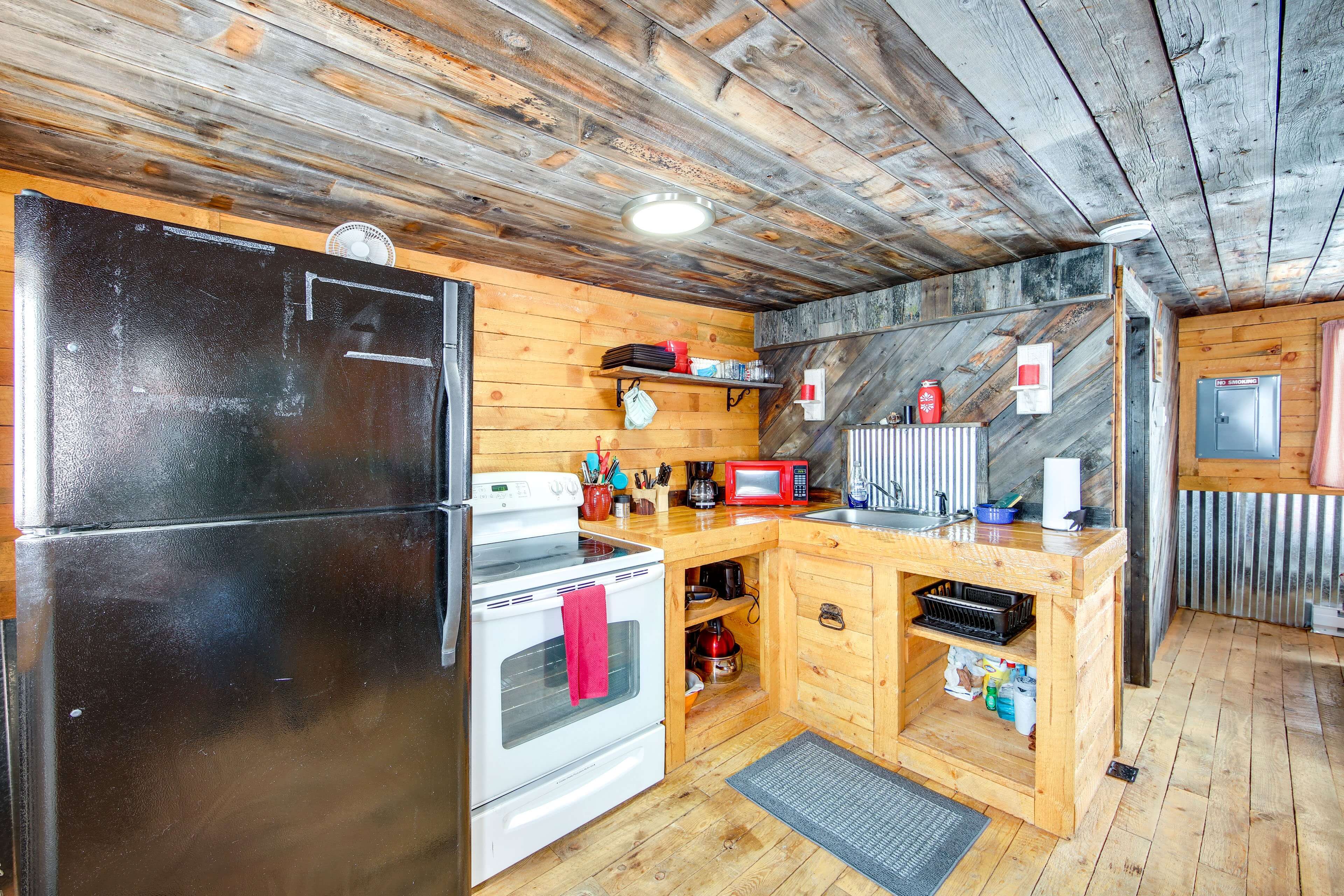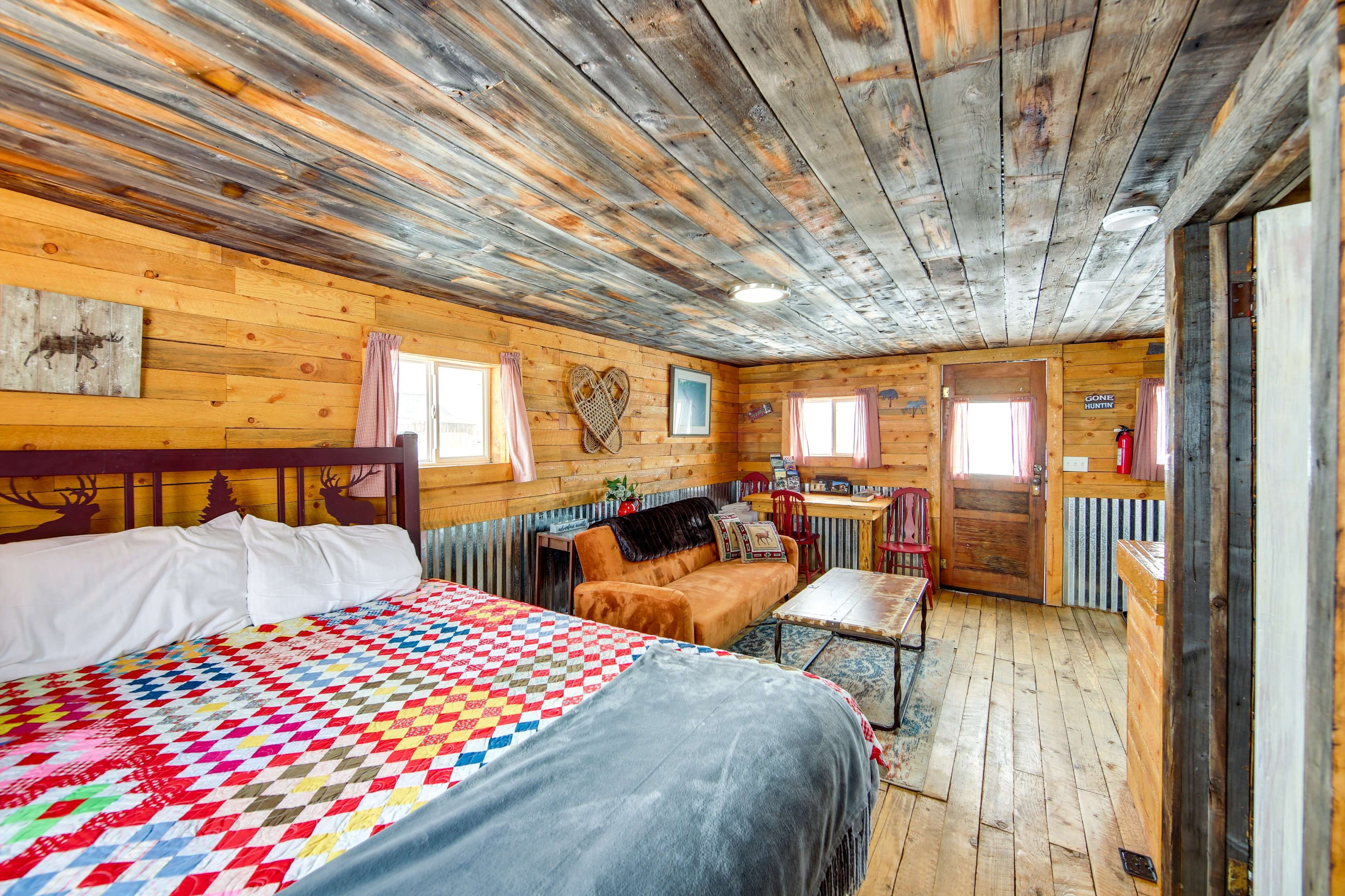Step inside to find a light-filled studio layout with simple comforts and vintage charm. There’s a queen bed tucked into the main space, a twin foldout couch, a full kitchen for easy meals, and a bathroom with a shower. A private porch looks out over open hills and changing skies… perfect for slow mornings or sunset unwinding. Inside or out, the Trapper is a quiet place to recharge between adventures.